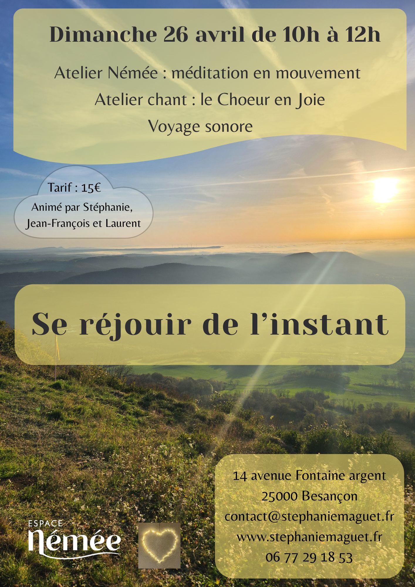 Prochainement à l’Espace Némée, un atelier intitulé « Se réjouir de l’instant » : quand le mouvement, le chant et le son viennent éveiller la Présence, la spontanéité, la joie et la simplicité de l’instant.Possibilité de partager le repas à l’issue de la matinée.